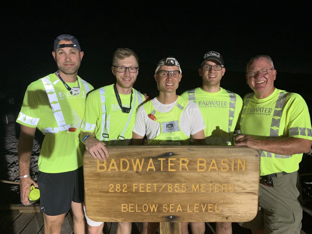 My race started at 9:30pm at the Badwater Basin in Death Valley National Park, CA. It was 115°F with a hot wind; almost claustrophobic. Took me about 10 miles to settle into a rhythm. It was so hot during this section; the wind felt like a cluster of blow dryers, relentlessly blowing. My throat was parched right away, but I kept telling myself that it felt similar to my heat training. Even though I had dreamt of running this section for more than a decade, I was so hot and ready to be done with it after just a couple hours. It didn’t matter how much ice was in bottles or hat, or how much water the crew would spray on me – I would be hot and dry within minutes. I was very careful in this section to watch my pace and effort.