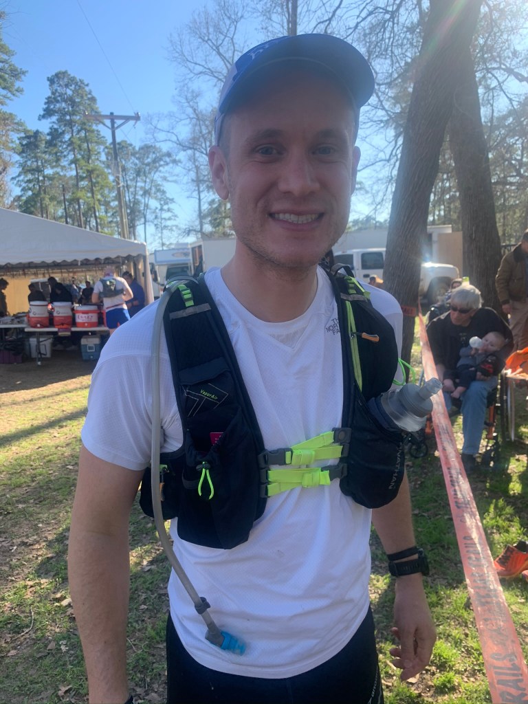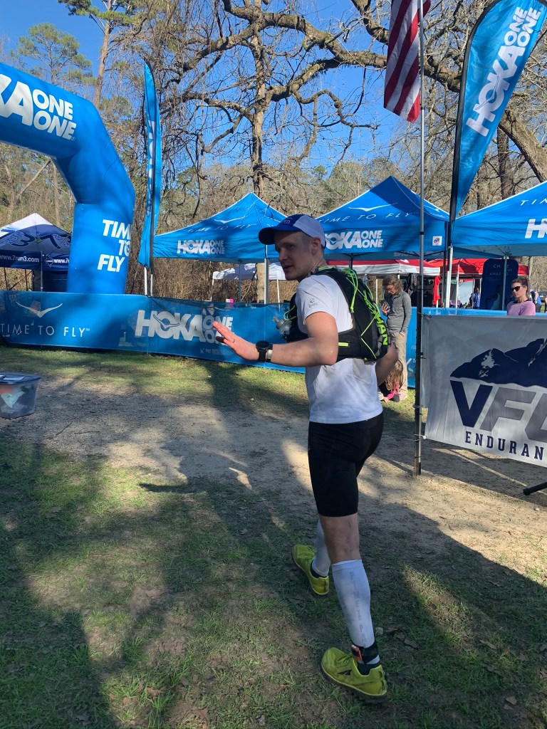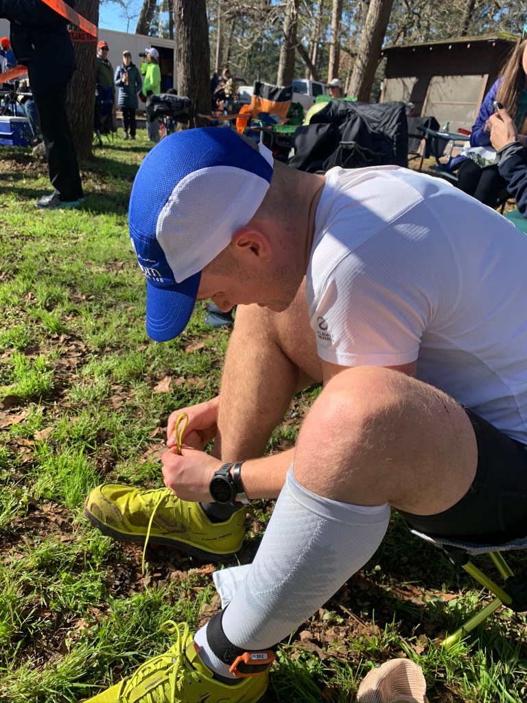 The race started off smoothly. With our campsite being just a 5min walk from the start, we didn’t get there until 15min before the race started. A tight chute to start the race meant the pack was close together for the first 0.5mi, but it wasn’t an issue. I took a quick bathroom break at the first aid station. Coming out of the bathroom, I walked for at least 3 min trying to fix my tube from my hydration pack. It was jammed with Maurten! This happened on my other long runs in January, but I thought I had figured it out this time. Once I finally got moving, I worked my way through the runners to make up a little bit of time. I tripped a few times on the roots, but nothing terrible. I felt like I was moving well and making good progress. The sun felt amazing as I was running out toward the Far Side aid station. I was still figuring out my new watch, so I was a bit concerned when I realized it was 8:20am at mile 14. After leaving in a hurry, I eventually remembered that the slow down built into my race plan was probably overly conservative (15% – 20% slowdown per lap works out to about 2min/mile/lap). I took my first fall coming back into Damnation; wasn’t paying close enough attention to the little roots. Not a big deal though. Over the last 10 or so miles of the first lap, I noticed that my calves were feeling unresponsive, kind of dead feeling. Not sure what this was all about.