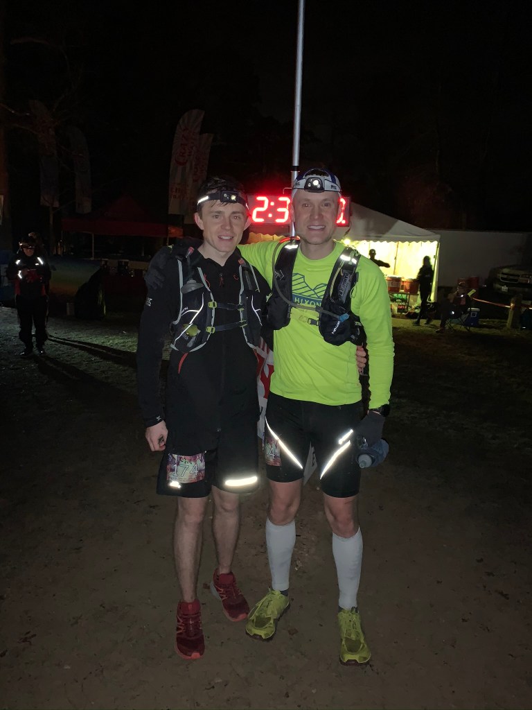 Matt and I decided to run this lap together as well; we ended up running the last 47 miles together! You get to know someone pretty well when you run together for about 10 hours. It was starting to cool back down and my lack of trail time during training showed a bit during this lap. I was moving OK through the roots, just more slowly than desired. I wasn’t able to move my feet very quickly and my ankles were starting to tire. This was the first lap that we started hiking the uphills. I was able to drink a bit more Maurten as more stomach settled in the cooler weather. The 40’s felt cool overnight, even though it is warmer than the high temps in Minneapolis for the past several months. As long as we kept moving, I was fine in a long sleeve shirt. I eventually put on a thin pair of gloves. I liked my headlamp + mini waist light combo; I never fell the last lap. However, there was a new? head/waist light that was insanely bright out on the trails that made the out and backs super challenging. I would literally need to walk a couple steps every time one of those lights got close to us; I was temporarily blinded each time. I’m sure those lights are great for point-to-points, but really hard on out-and-back courses. Even though this lap took awhile, I kept in good spirits. I added a few oranges to my diet as they looked delicious. I definitely ate more solid food this lap, but lagged on my gels. I think I only ate the two caffeinated Maurten gels, no Hammer gels. I was peeing mostly clear the last lap, so water was good. Just like all other 100’s, the last few miles seemingly take forever. But Matt and I pushed into the finish just after 2:30am!